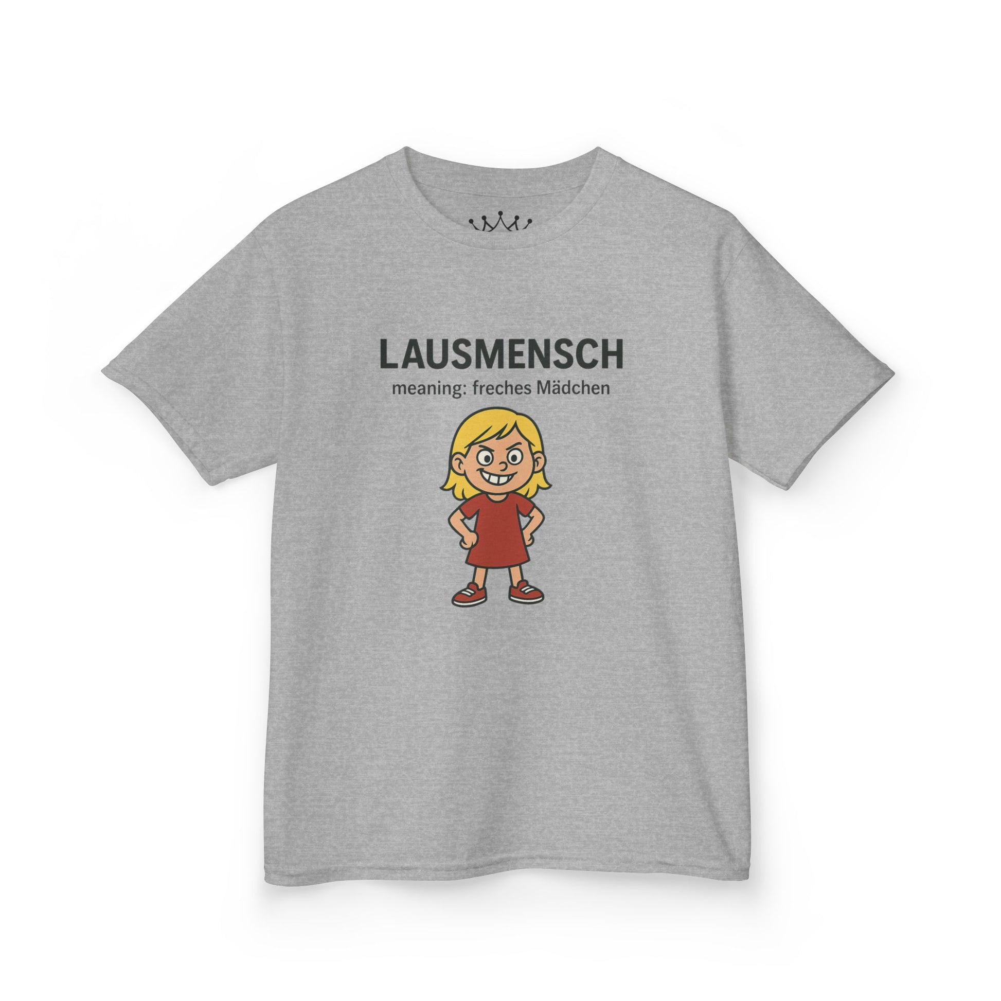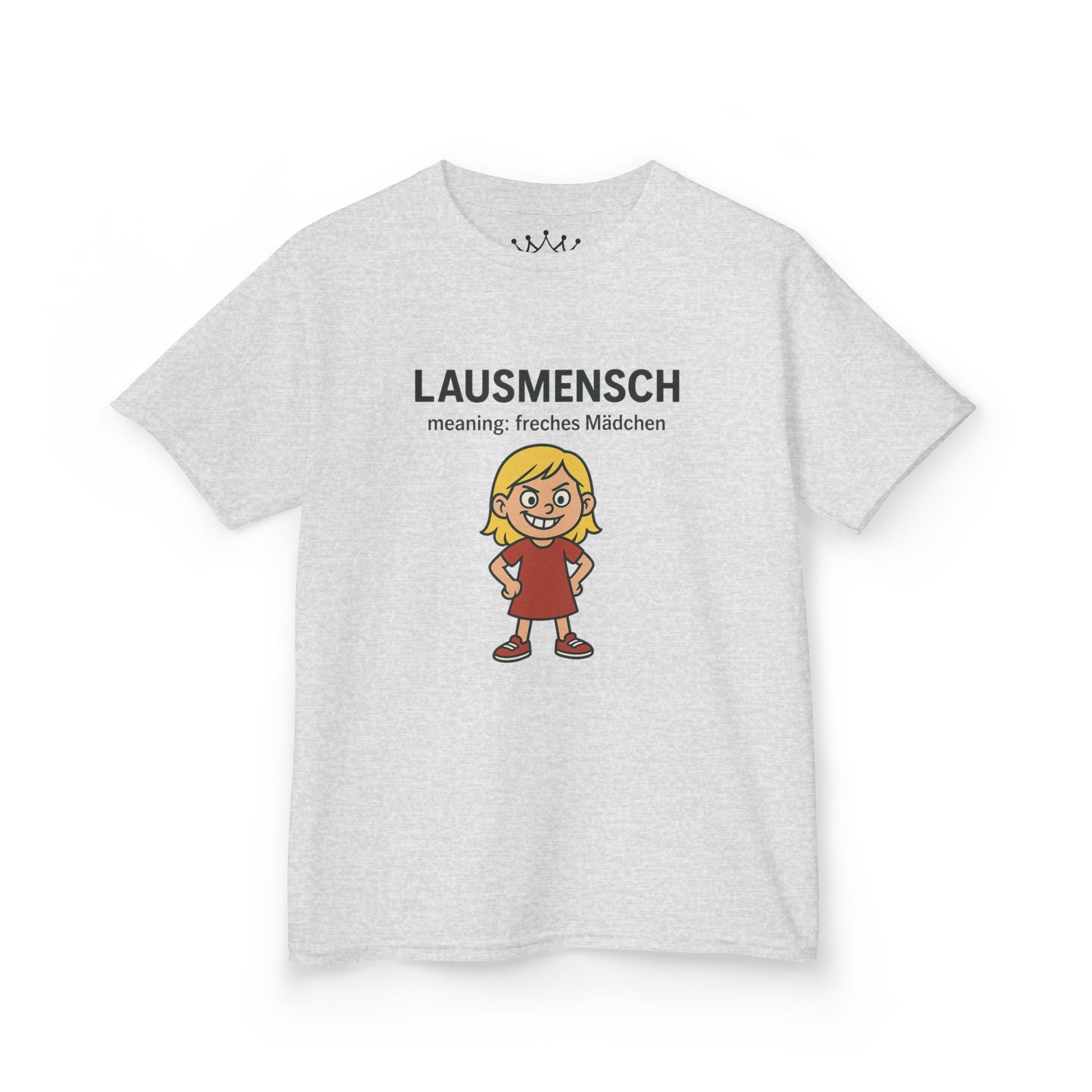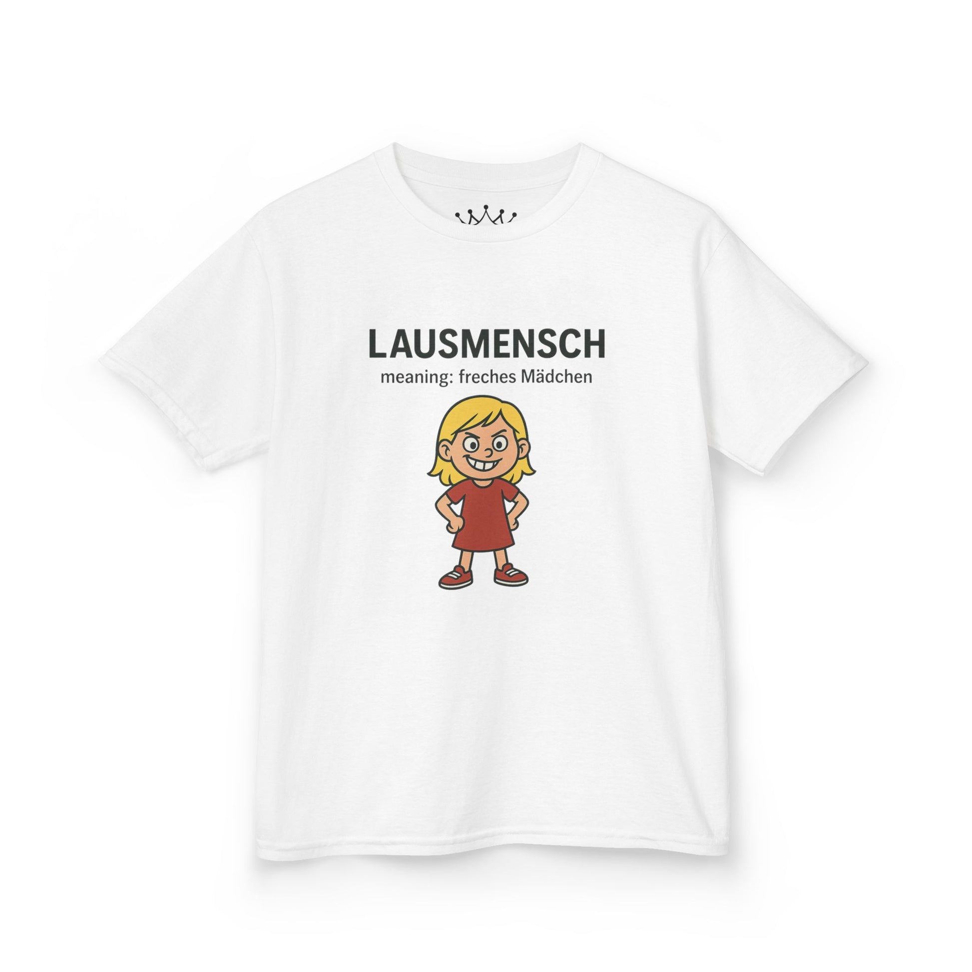 Ein süßes und witziges Kinder-T-Shirt – perfekt für kleine Mädchen! Das Shirt trägt das österreichische Wort „Lausmensch“, was so viel wie „freches Mädchen“ bedeutet, und bringt damit auf charmante Weise Persönlichkeit in die Garderobe jeder kleinen Wirbelwindin. Ideal für den Alltag und bequem für kleine Kinder – dieses Shirt macht einfach Spaß!