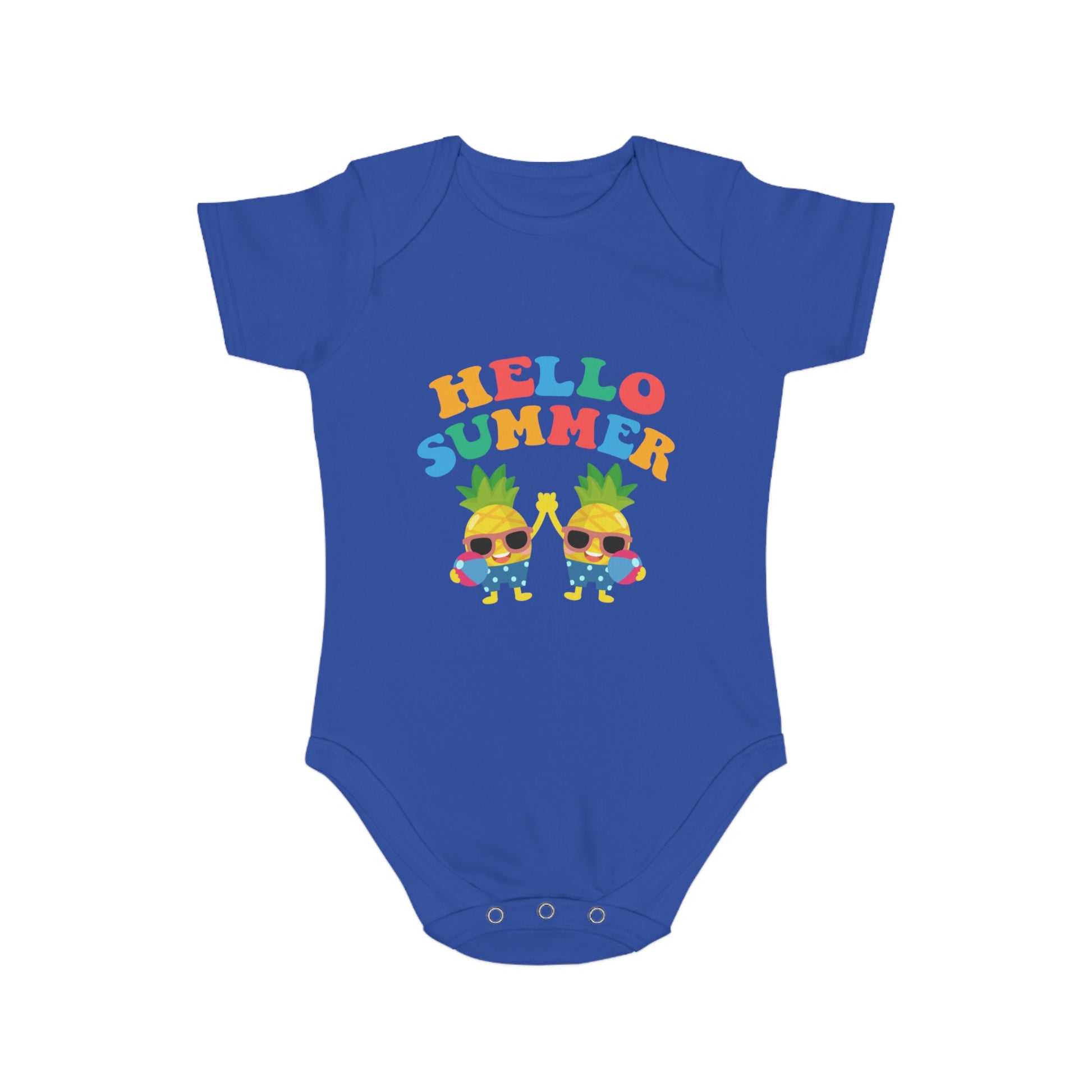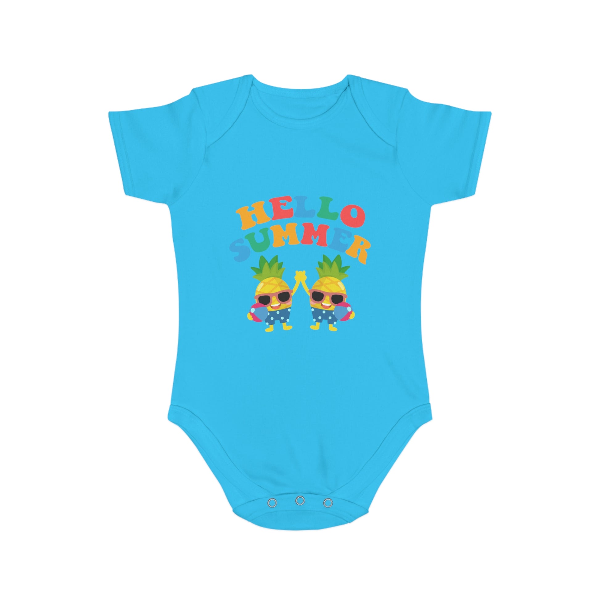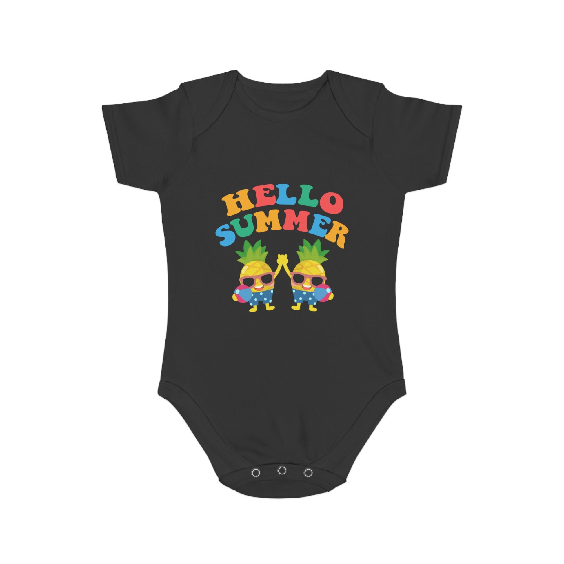 Stell dir den perfekten Sommerlook für dein Baby vor – unser kurzärmeliger Baby-Body vereint niedliches Design mit praktischem Komfort! Ob für Spielnachmittage, Familienfeiern oder einfach zum Entspannen zu Hause – dieser Body versprüht fröhliche Sommerstimmung. Das verspielte Motiv mit sommerlichen Elementen wie Ananas und fröhlichen Figuren macht ihn schnell zum Lieblingsstück im Kleiderschrank.